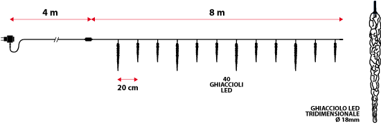 Diese Eiszapfen-Lichterkette ist 8 m lang und besteht aus 40 transparenten Eiszapfen auf grünem PVC-Kabel. 14 Eiszapfen sind 16 cm, 26 sind 11 cm hoch. Sie enthalten kaltweiße LEDs und leuchten statisch.