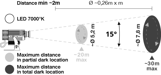 Je nach Entfernung kann ein Bild mit einem Durchmesser zwischen 0,52 und 7,8 Metern projiziert werden. Der Projektor sollte zwischen 2 und 30 m von der Wand entfernt aufgestellt werden. Diese Werte gelten für Projektionen auf unbeleuchtete Flächen.
