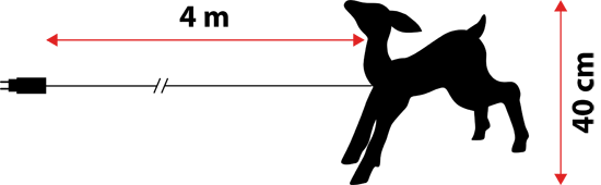 Das Rentier wird mit einem eigenen Transformator geliefert, der mit einem 4 Meter langen Stromkabel verbunden ist, welches die elektrische Spannung reduziert und Ihnen somit eine sichere Dekoration garantiert.
