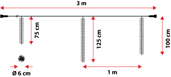 Auf einem 3 Meter langen Draht finden drei Lichttropfen im Abstand von einem Meter ihren Platz. Er ist mit LEDs bestreut, die sehr dicht beieinander sind und warmweiße Lichter besitzen