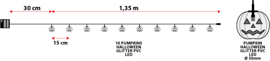 1,35 m lange Lichterkette für den Innenbereich mit 10 mit Glitzer bedeckten Kürbissen auf schwarzem Kabel. Jeder Kürbis besteht aus 2 Pvc-Folien und enthält eine orangefarbene LED mit Dauerlicht.