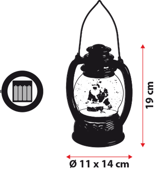 Die Laterne ist 19 cm hoch und 14 cm breit. Sie funktioniert mit 4 Batterien vom Typ AAA, die nicht im Lieferumfang enthalten sind. Durch den Kauf des optionalen Trafos ist der Strombetrieb auch möglich.