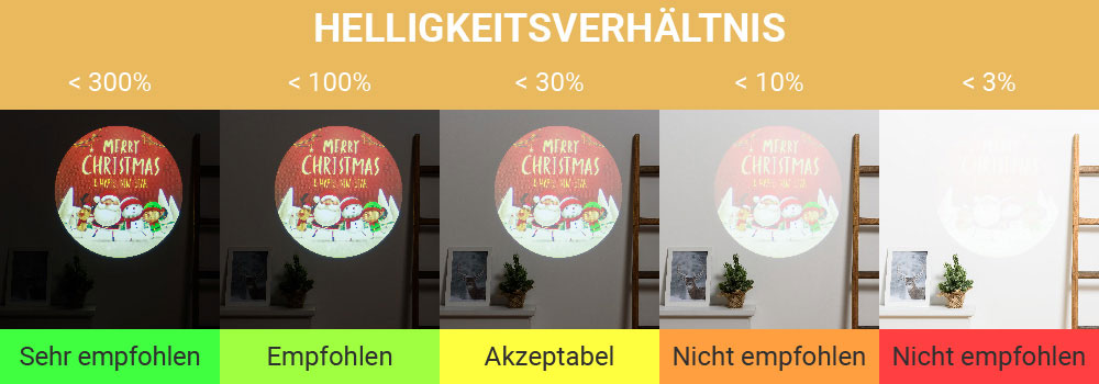 Helligkeitsverhältnis = Lux des Projektors / Lux im Raum