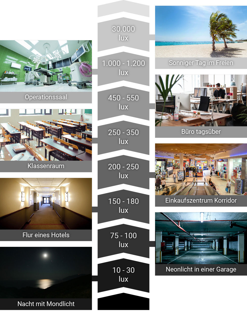 Dieser Wert wird in Lux ausgedrückt. Je höher der Lux Index, desto größer die Helligkeit an der Wand.