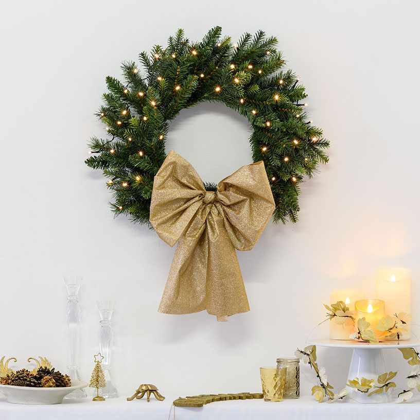 Gold kommt nie aus der Mode. Es ist eine der am häufigsten verwendeten Metallfarben zu Weihnachten, weil es die Weihnachtsdekoration zum Glänzen bringt und das Ambiente erwärmt. Und wenn Sie denken, dass Gold nur zu einer sehr aufwendigen Dekoration passt, dann schauen Sie sich den Effekt dieser Farbe auf unserem Weihnachtskranz an!