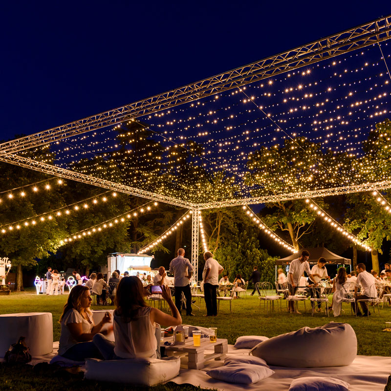 Wenn der Sternenhimmel für die Hochzeit sehr groß ist, ist es am Besten, unsere professionellen Lichter zu benutzen, aufgrund ihrer Koppelbarkeit und ihrem breiten Sortiment an Zubehörteilen. Das Gleiche gilt für einen äußeren Sternenhimmel, der für eine ganze Jahreszeit draußen bleiben soll: entscheiden Sie sich für Qualitätsprodukte, die dem schlechtesten Wetter standhalten.