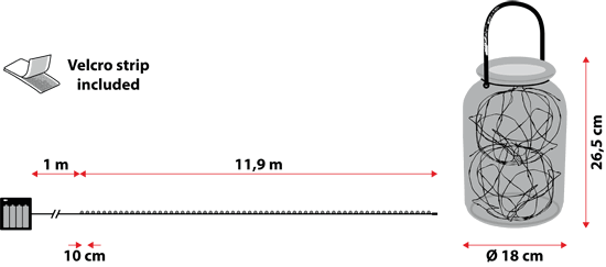 Die Lichterkette funktioniert mit 4 x AA Batterien, welche nicht im Lieferumfang enthalten sind. Die Abmessungen des Batteriehalters sind 7 x 6,5 x 1 cm.