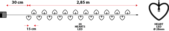 4 / 5 - Catena a batteria 2,85 m, 20 cuori satinati, led rosso