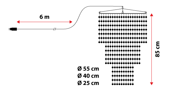Dieser 3D-Pendelluchte ist eine elegante Lichtdekoration, die die Aufmerksamkeit jedes Betrachters auf sich ziehen wird. Die Abmessungen des Kronleuchters betragen: Durchmesser 55 Zentimeter, Gesamthöhe 85 Zentimeter. Er besteht aus 3 ineinander gestapelten Kaskaden mit den Maßen Ø 55 x H. 35 Zentimeter, Ø 40 x H. 60 Zentimeter und Ø 25 x H. 85 Zentimeter.