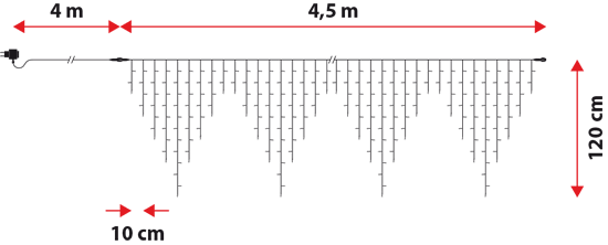 Diese Eiszapfen-Lichterkette ist 4,5 m breit und 1,2 m hoch und ist mit 270 statisch leuchtenden LEDs und 30 blinkenden LEDs bestückt. Den Abstand zwischen den unterschiedlich langen Strängen beträgt 10 cm.