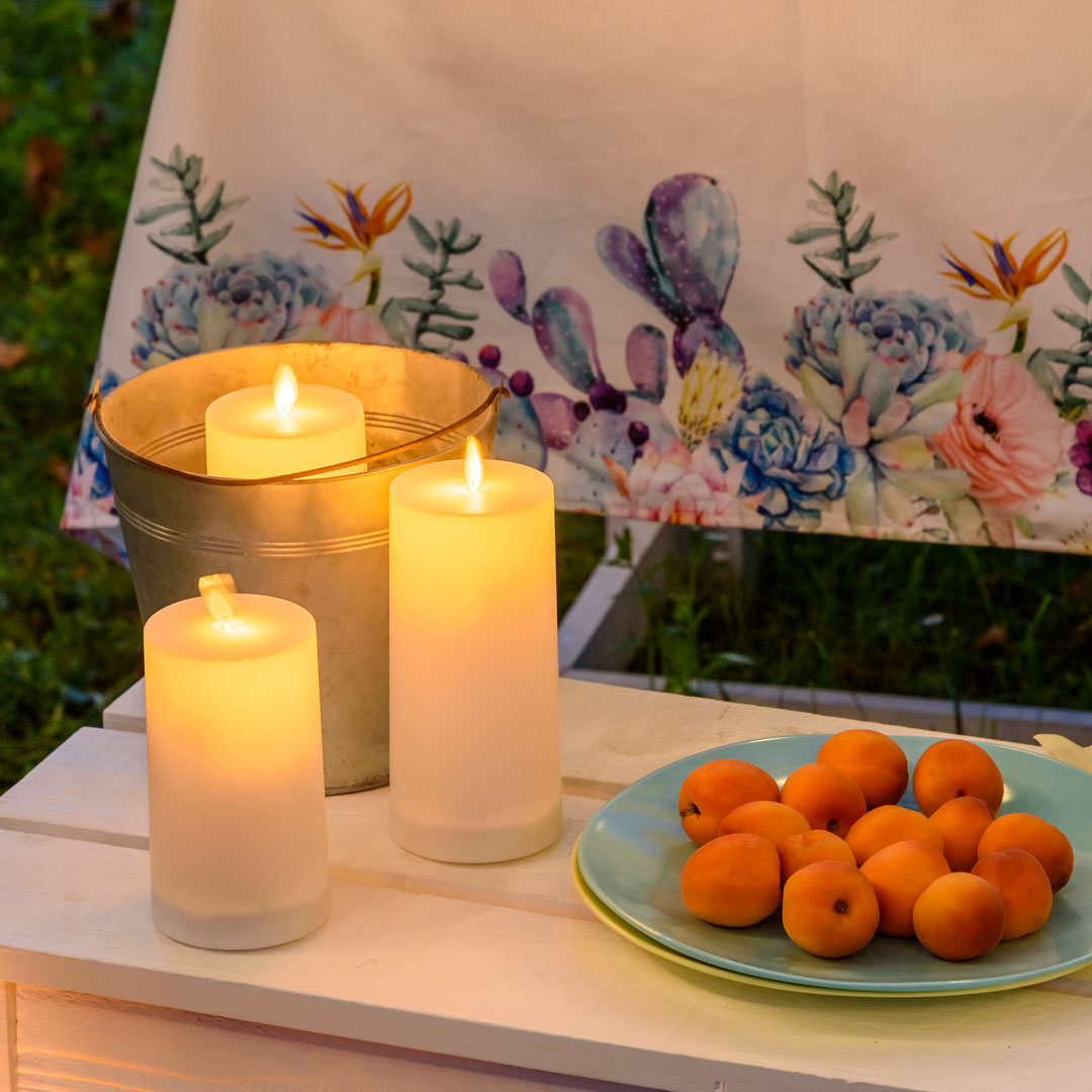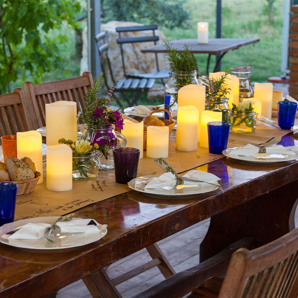 Kümmern Sie sich um die sommerliche Tischgestaltung und richten Sie warmweiße LED Kerzen unterschiedlicher Größe entlang den Tischläufer ein. Sie kreieren eine schöne Atmosphäre, sie sind sicher und verbrennen nichts.