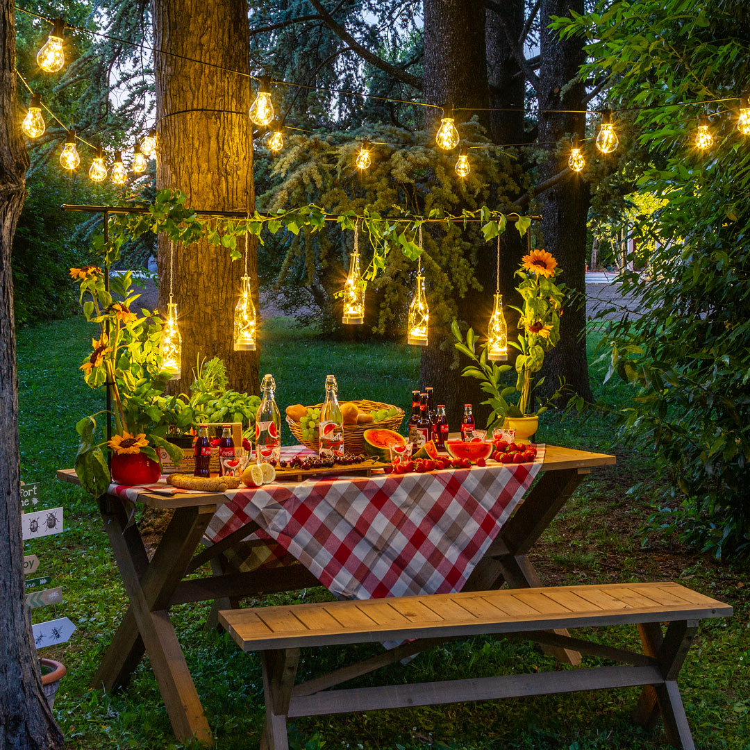 Ergänzen Sie die Beleuchtung des Gartens durch Partylichter oder durch LED Flaschenlichter, die ideal sind, um einen originalen Tischläufer zu kreieren.