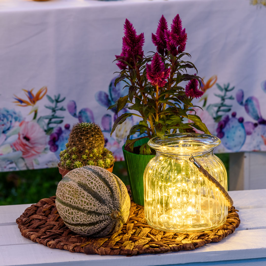 Verbreiten Sie die Magie des Sommers auf dem Tisch und auf der Wiese durch praktische und ungefährliche LED Kerzen und durch LED Dekogläser-Lichterketten. Sie können sie auf unserer Website finden oder sie einfach selber machen.