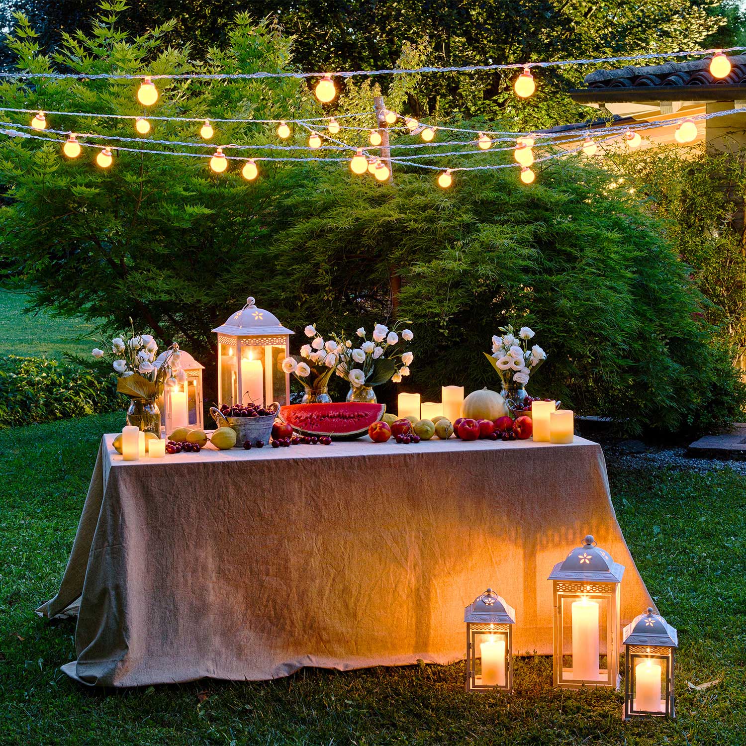 Ergänzen Sie die Beleuchtung des Gartens mit weißen Laternen unterschiedlicher Größe und stellen Sie sie um den Tisch.