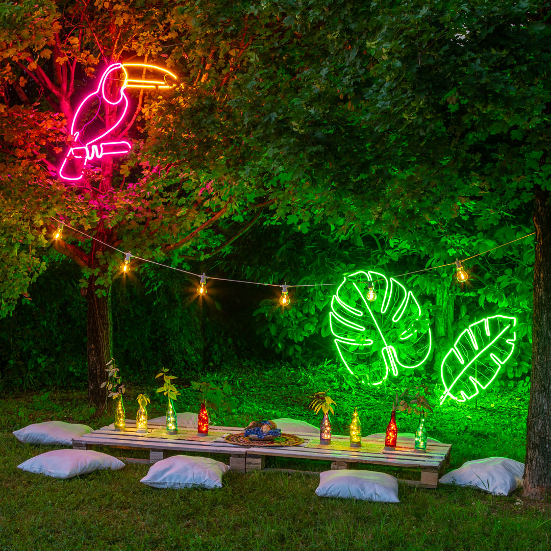 Um einen Tropenwald zu realisieren, füllen Sie Ihr Garten mit Ihren bevorzugten LED Neon Dekolampen auf: schlagen Sie Papageien und Tukane an den höchsten Zweigen an und bringen Sie tropische Blätter zwischen den Büschen an;