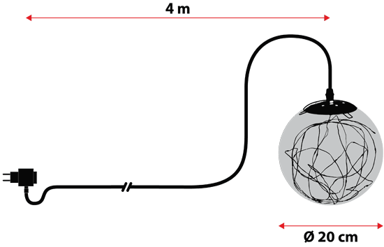 Zum Aufhängen dient das 4 m lange schwarze Zuleitungskabel. Dank dem Niederspannungsbetriebs kann dieses Dekostück überall mit absoluter Sicherheit eingesetzt werden. Ob an Holzbalken in rustikalen Räumen, in einer Lounge-Ecke oder in einem edlen Shop, überall strahlt diese innovative LED-Lampe Stil und Eleganz aus.