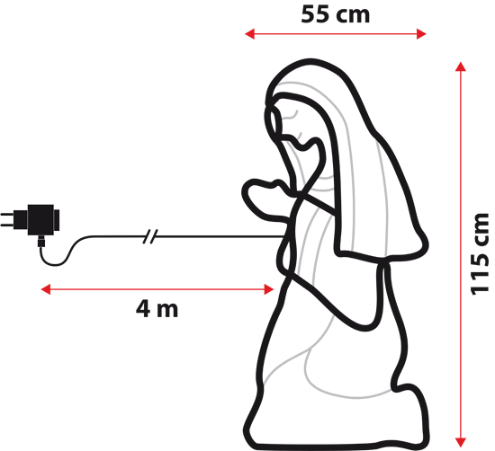 Die Leuchtfigur ist aus Metall hergestellt, ist 115 cm hoch und mit einem warmweißen Lichtschlauch umrandet, der ständig leuchtet.