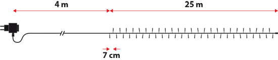 Die Lichterkette ist 25 m lang und hat 360 MiniLEDs auf einem grünen Kabel.