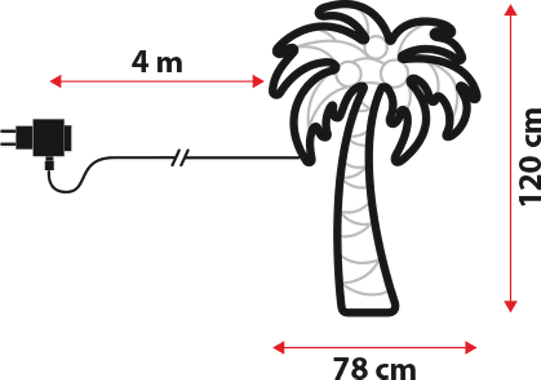 Diese große Palme besteht aus einem weiß beschichteten Metallgestell (78 x h 120 cm) und aus hochwertigem beidseitig leuchtendem LED-Lichtschlauch. 672 LED-Lampen leuchten gleichmäßig ununterbrochen und erzeugen dabei eine intensive Leuchtwirkung.