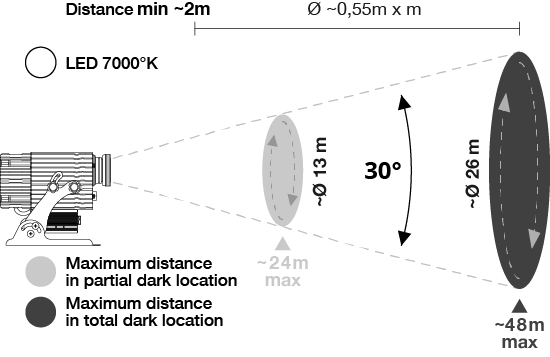 Je nach Entfernung kann ein Bild mit einem Durchmesser zwischen 1,10 und 26 Metern projiziert werden. Der Projektor sollte zwischen 2 und 48 m von der Wand entfernt aufgestellt werden. Diese Werte gelten für Projektionen auf unbeleuchtete Flächen.