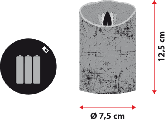 Die Kerze hat eine Höhe von 12,5 cm und einen Durchmesser von 7,5 cm. Der raue Kerzenkörper und die bewegliche Flamme wirken extrem realistisch.