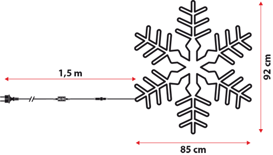 Der leuchtende Schneekristall hat einen Durchmesser von 90 cm und besteht aus einem weißen Metallrahmen, der von einem Lichtschlauch mit punktförmigen LEDs bedeckt ist.