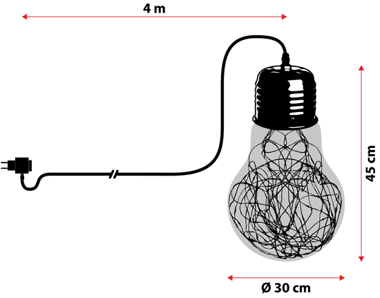 Zum Aufhängen dient das 4 m lange schwarze Zuleitungskabel. Dank dem Niederspannungsbetriebs kann dieses Dekostück überall mit absoluter Sicherheit eingesetzt werden. Ob an Holzbalken in rustikalen Räumen, in einer Lounge-Ecke oder in einem edlen Shop, überall strahlt diese innovative LED-Lampe Stil und Eleganz aus.