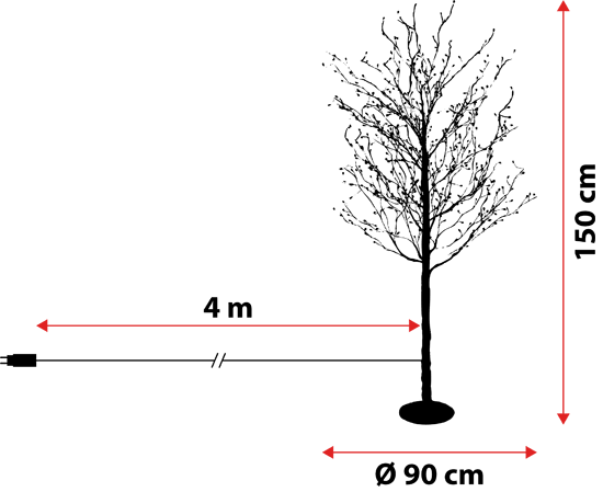 Er ist mit einem Metallsockel ausgestattet, der abgenommen werden kann, wenn man den Zweig zum Beispiel in eine Vase stellen möchte, und mit einem 4 m langen Stromkabel, in das der Transformator bereits eingesteckt ist, so dass man ihn überall aufstellen kann. Sie können den Baum sowohl im Innen- als auch im Außenbereich verwenden.