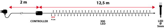 Christmas string light, 300 warm white LEDs on 12.5 metres dark green/black cable. Both for indoor and outdoor use.