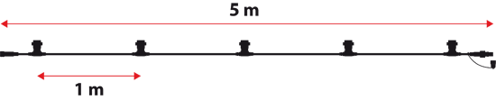La catena ha robusti cavi in gomma di colore nero (sezione del cavo di 2 x 1,5 mm2) con 5 portalampade E27 resistenti all'acqua (IP44) distribuiti sui 5 metri di lunghezza.