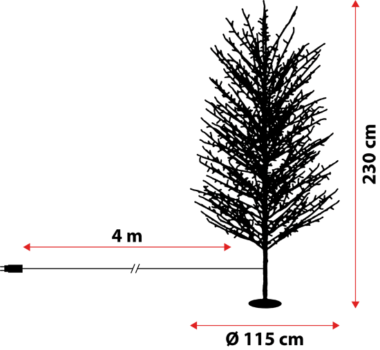 The tree is 230 centimeters tall and, thanks to the malleable metal branches, it can be opened to a diameter of 115 centimeters, giving it an elegant and refined look.