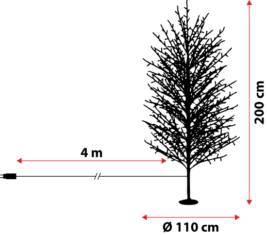 The tree is 200 centimeters tall and, thanks to the malleable metal branches, it can be opened to a diameter of 110 centimeters, giving it an elegant and refined look.