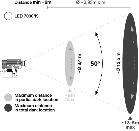 - Projected image: Ø min 1.86 m - max 12.5 m
