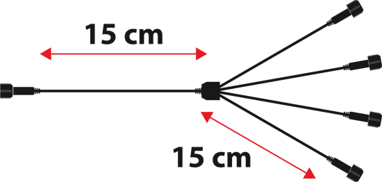 Features one male connector and 4 female connector. The first one is connected to the power cable, the others to the lights.