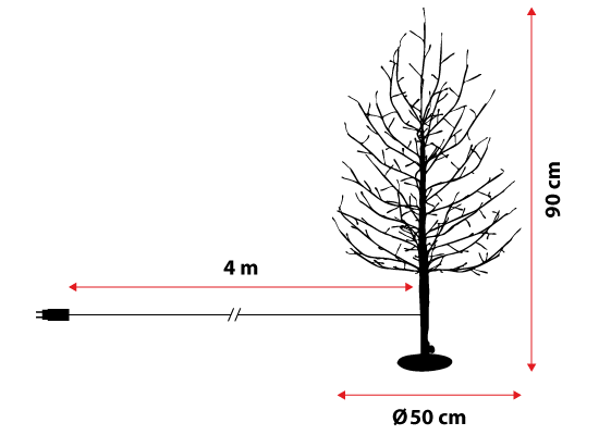This tree stands 90 centimeters tall and features a series of branches extending from the trunk, which are flexible thanks to the metal core running through them, allowing it to be adapted to your decorative needs. Additionally, when opened, this tree can reach a diameter of 50 centimeters, providing a truly remarkable visual effect.