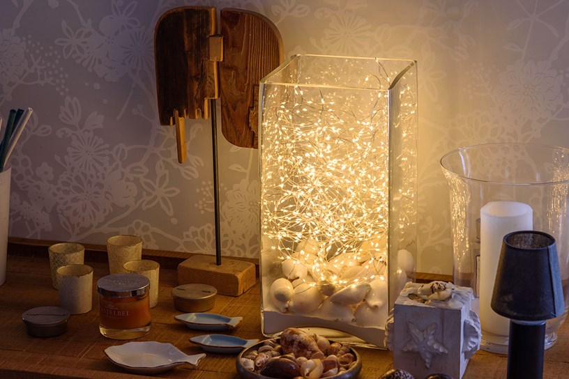 Si te gustan las manualidades y todas las ideas DIY que se encuentran en internet pero no sabes por dónde empezar, ¡no te preocupes! Es mucho más fácil de lo que piensas. Coge un jarrón de cristal grande, llena la base con conchas o chinos e ilumínala con una guirnalda de microLED. Su finísimo cable y pequeño porta pilas harán que sólo se vean las luces brillar.