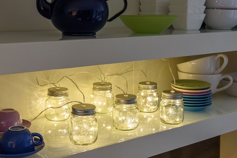 A todos nos encanta tener una cocina de revista. Pero la realidad y el día a día hacen que en la mayoría de los casos sea imposible. Por eso se nos ocurre dale un toque especial con tarros de cristal iluminados por pequeños microLED. Los podrás colocar sobre una repisa o colgarlos de la pared en el rincón del desayuno, ¿qué mejor forma de dar los buenos días?