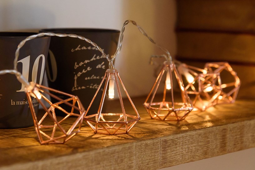 ¿Eres amante de las tendencias? Entonces sabrás que el color cobre y las figuras en forma de diamante están en la cresta de la ola. Coloca en la repisa del salón o de tu habitación una guirnalda con estos originales diamantes que además te ayudarán a crear un ambiente muy acogedor con sus cálidas luces.