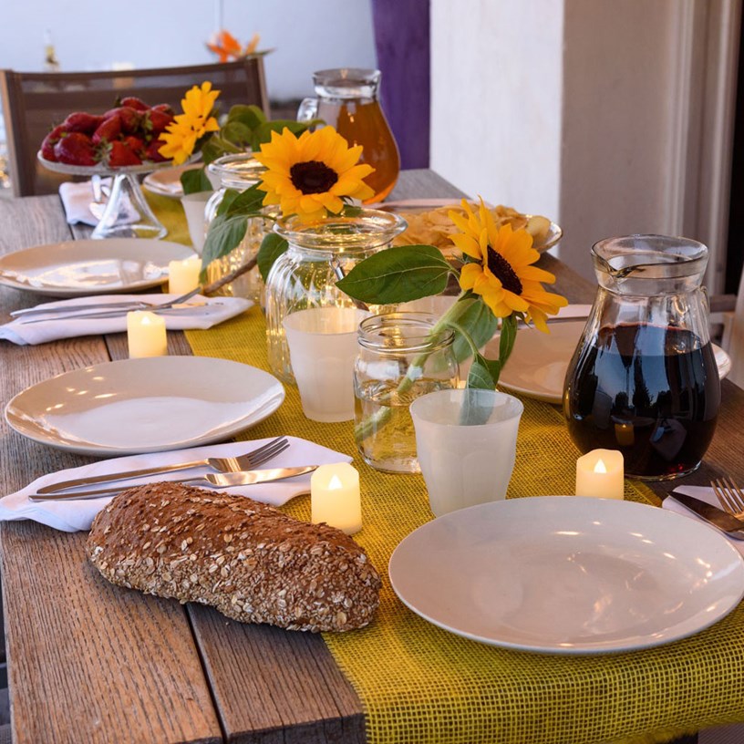 ¿Quieres organizar una cena especial pero sin demasiados oropeles? ¿Prefieres un estilo sencillo pero a la vez lleno de sabor y detalles? Entonces este tipo de decoración es perfecta para ti: Una mesa de madera con un mantel tipo caminos de mesa de color amarillo y tarros con grandes girasoles que llenarán de personalidad la mesa dotándola de vida y calidez al mismo tiempo.