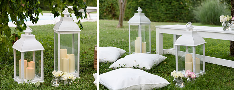 Para dar luz al césped y delimitar el espacio, usamos faroles grandes iluminados con velas LED. Sus líneas limpias y su acabado vintage casa perfectamente con cualquier estilo. Pensaba que necesitaríamos más pero con dos más grandes y otros dos más pequeños ha quedado ideal.