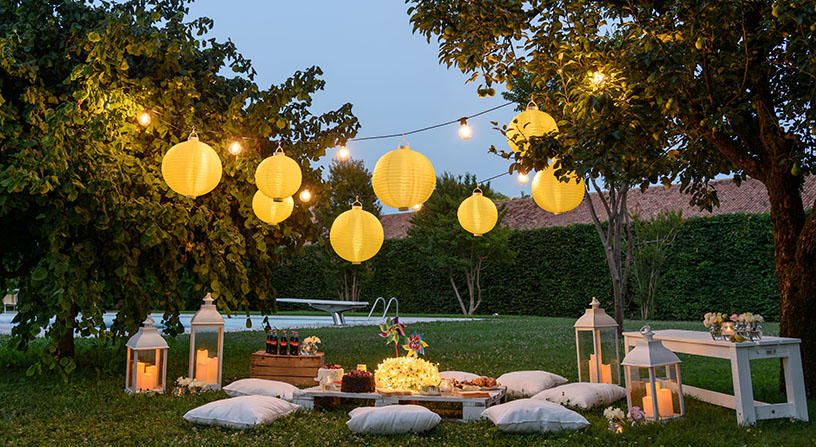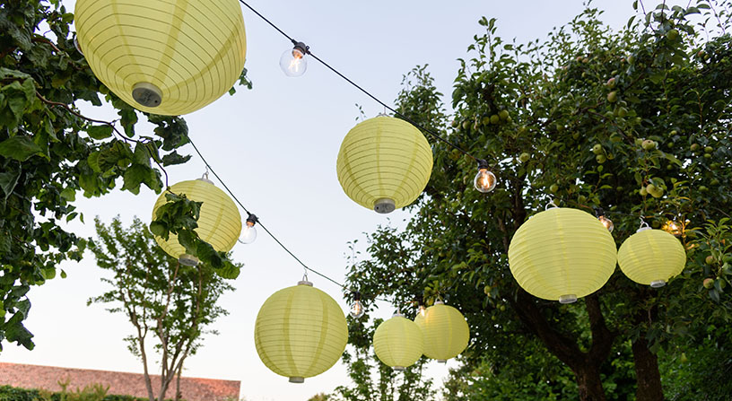 Para delimitar el espacio y darle un toque de luz hemos usado una guirnalda de bombillas globo de 8 metros de largo y 8 farolillos de tela amarilla de distintos tamaños que cuelgan directamente del cable de la guirnalda gracias al gancho que incluyen y su poco peso.
