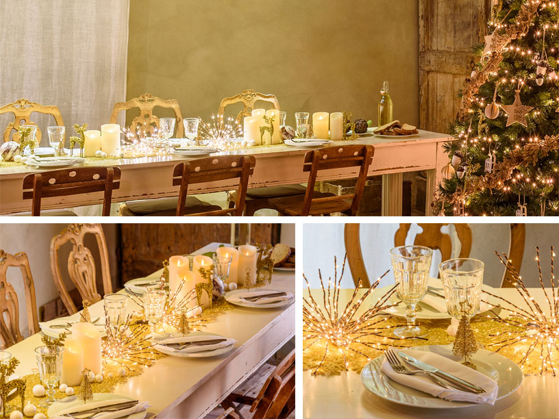 ¡Mira qué bonita nos ha quedado la mesa para la cena de Nochebuena! Hemos partido de una mesa blanca de estilo shabby y decorado con luces para la mesa de Navidad en tonos dorados: el camino de mesa dorado, marcasitios en forma de arbolitos también dorados, renos con purpurina y para iluminar velas Led color marfil de distintas alturas. El toque original lo dan dos ramas luminosas Twigball con pequeñas lucecitas incrustadas en un fino cable color cobre.