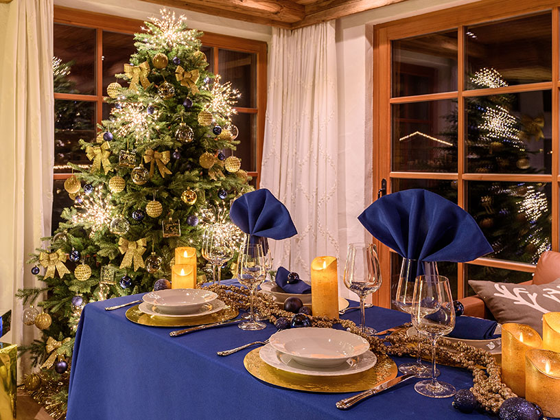 En este caso se ha optado por poner el mantel y las servilletas en azul, y dejar el dorado para los pequeños detalles que componen el centro de mesa: velas de cera doradas y un camino de mesa navideño hecho con una guirnalda de bolas doradas.