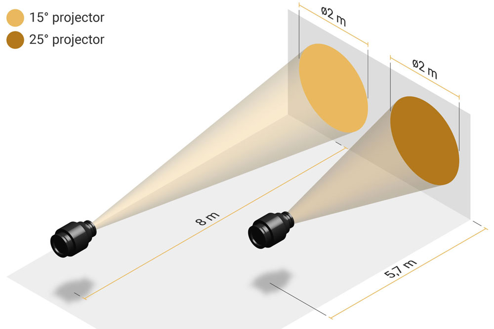 La intensidad de la luz es directamente proporcional a la potencia y está relacionada con el ángulo de proyección y la distancia. Entre dos proyectores con la misma potencia, aquel con el ángulo de proyección más grande resulta más luminoso ya que está a sólo 5,7 metros de la pared: