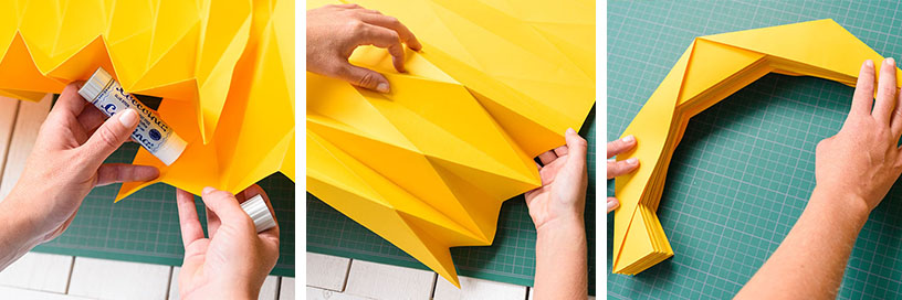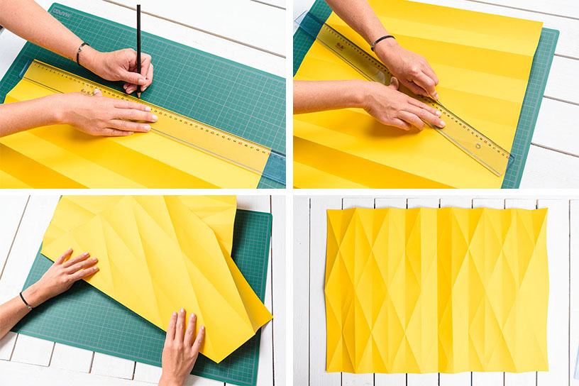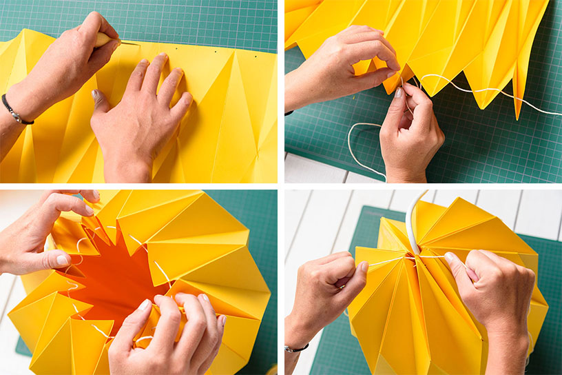 - Empezamos a plegar para obtener la forma de nuestra lámpara. Fíjate bien en la imagen y ten paciencia porque aunque la cartulina es un material fuerte se puede romper;
