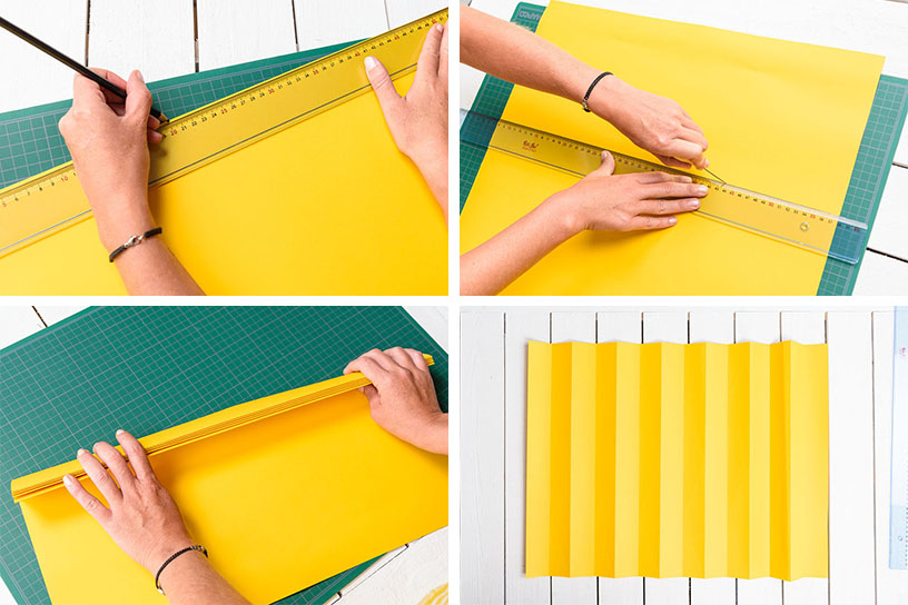 - El primer paso es hacer las líneas verticales paralelas, con una separación entre sí de 5 centímetros. Te aconsejo que marques la cartulina tanto en el margen inferior como el superior.;