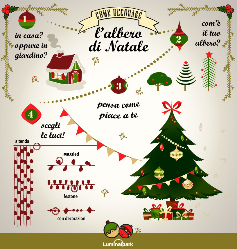 El árbol con el que decoramos el interior de una casa normalmente es de pequeñas dimensiones, por lo que además de las luces podemos colocar adornos navideños. Sin embargo los árboles en exteriores, al ser más grandes, utilizaremos sólo luces para decorarlo, por lo que éstas deberán ser más intensas y luminosas.