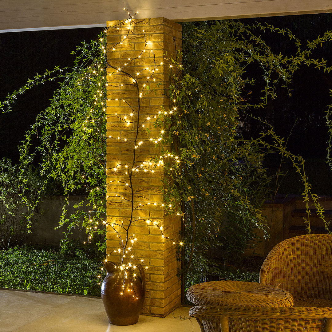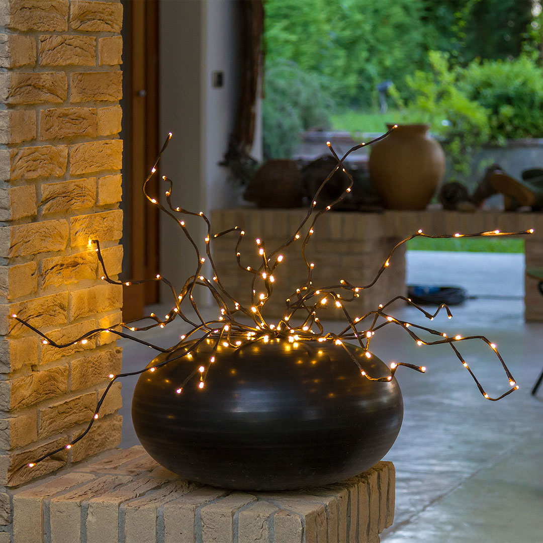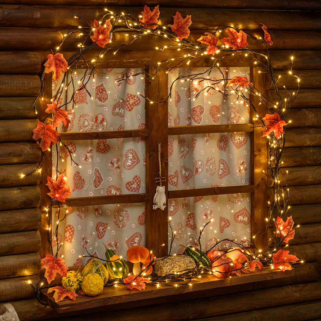 Ideales para esta época del año, son las ramas de luces que con o sin hojas imitan perfectamente la forma y los colores de las hojas secas de los árboles. Llenarán de luz un rincón por sí solas o decoradas con piñas, hojas, flores y pequeñas adornos en forma de calabazas. En su versión más pequeña quedarán geniales en un tiesto de barro. En un porche, coloca la rama luminosa escalando una columna como si de una rama de hiedra se tratase.