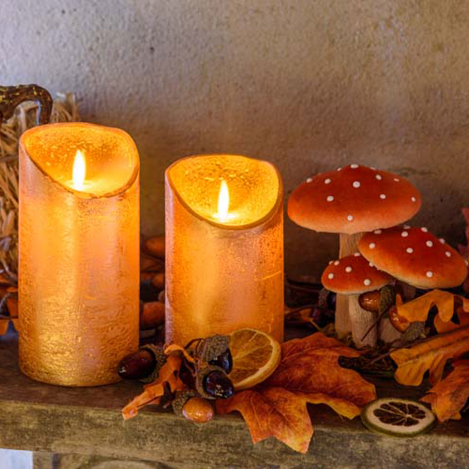 Las velas son elementos indispensables a la hora de decorar en otoño. Utilízalas de forma aislada o combinadas con otras de distintas alturas y tamaño. También las puedes decorar con lazos o materiales naturales para hacer resaltar su belleza.