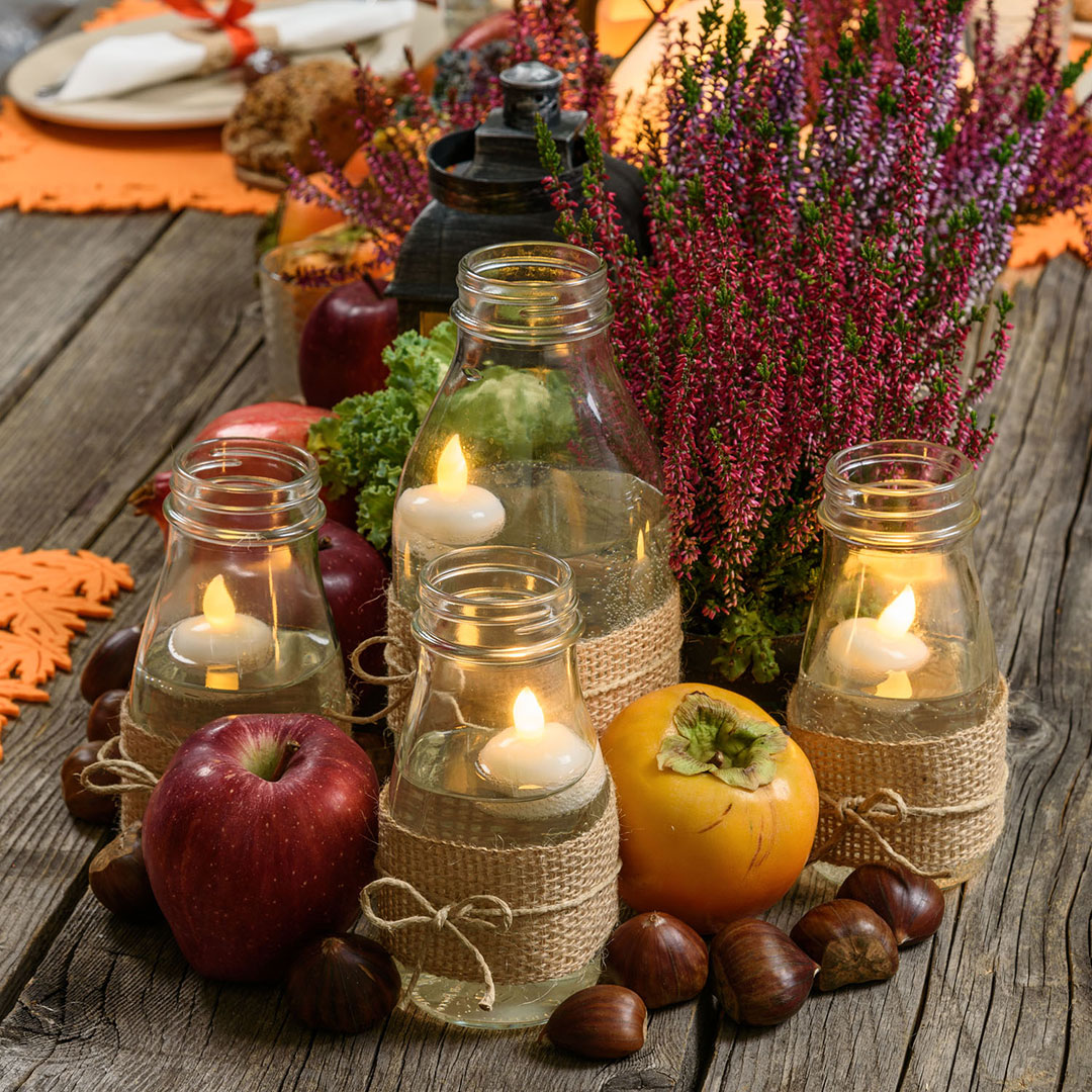 Lo que verdaderamente hace destacar este centro de mesa otoñal es el uso de la luz: las velas LED hechas de cera natural y las pequeñas velas de té flotantes en tarros de cristal crean un agradable ambiente con sus luces tenues que además hacer resaltar los contornos y colores de los objetos que tienen a su alrededor.